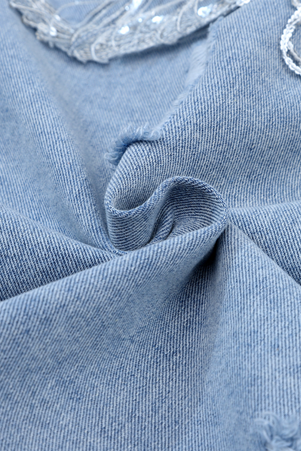 Sequin Fringe Trim Distressed Button Up Denim Jacket
